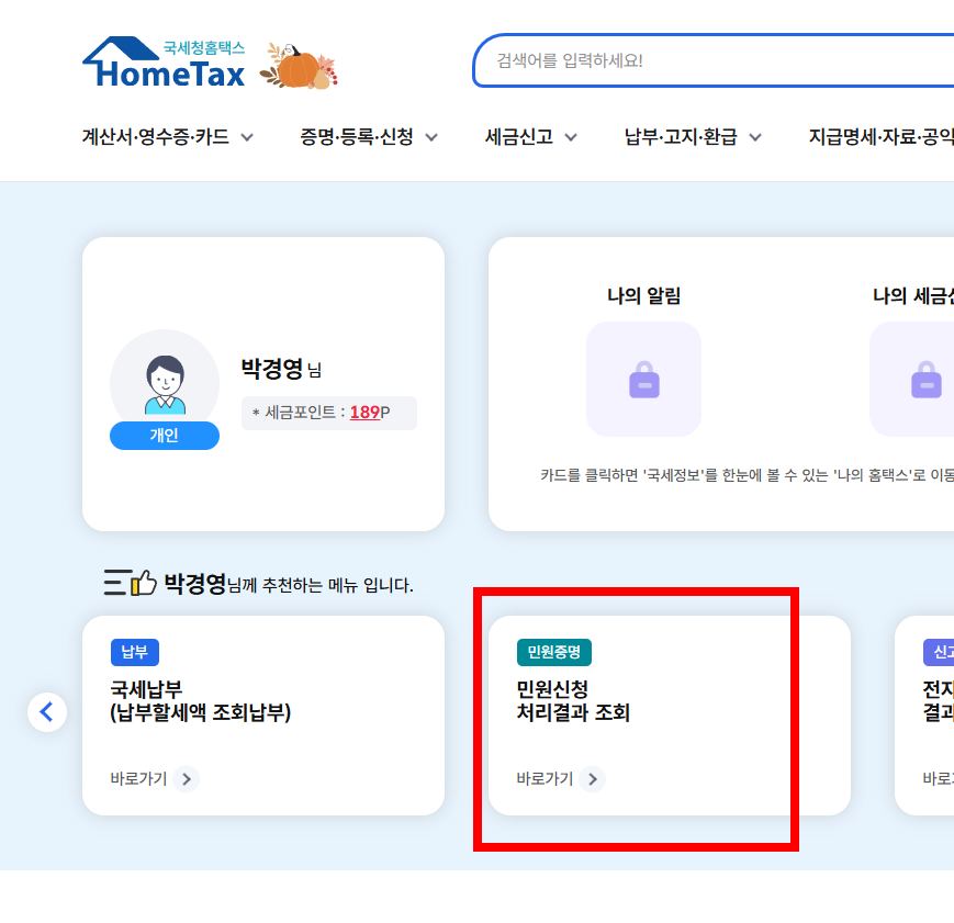 홈텍스에 다시 들어가서 민원 처리결과 를 누르고 들어갑니다.