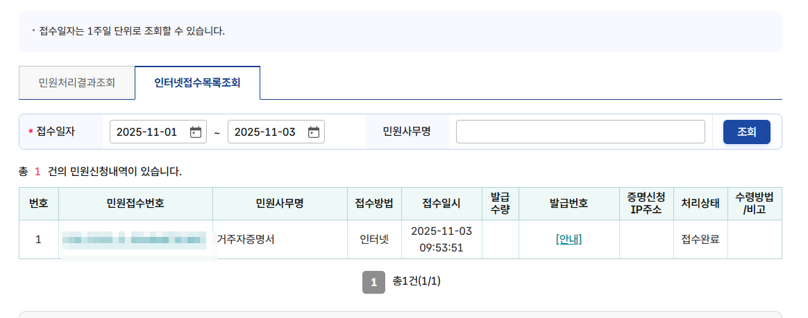 처리상태: 접수완료로 나옵니다.