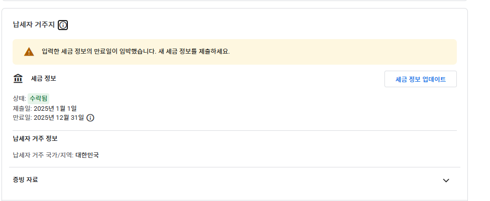 Google Payments: 귀하의 납세자 거주지 세금 정보가 2025년 12월 31일에 만료됩니다