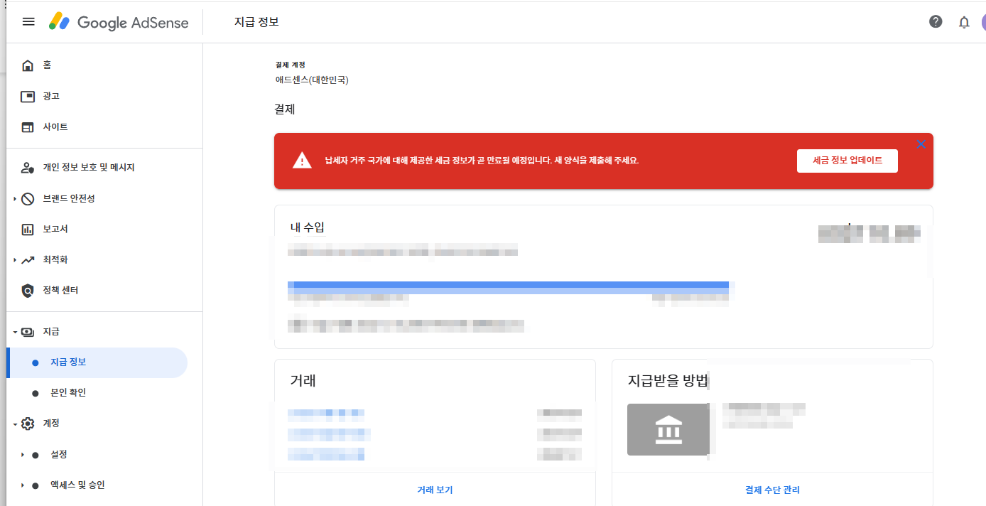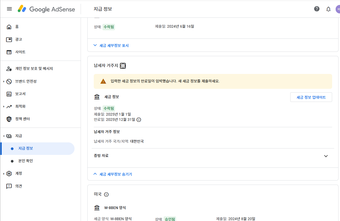 에드센스 / 지급 / 지급정보 - 납세자 거주지 항목을 보면 아래와 같이 세금 정보 만료일이 되었다는 알림이 떠 있습니다.