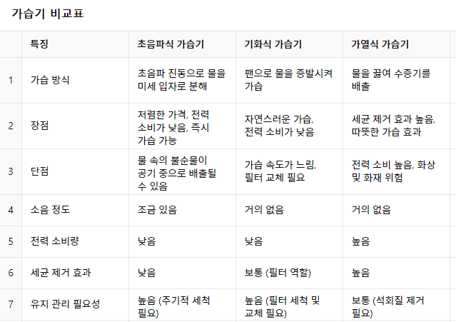 가습방식별 비교표(초음파, 기화식, 가열식 비교)