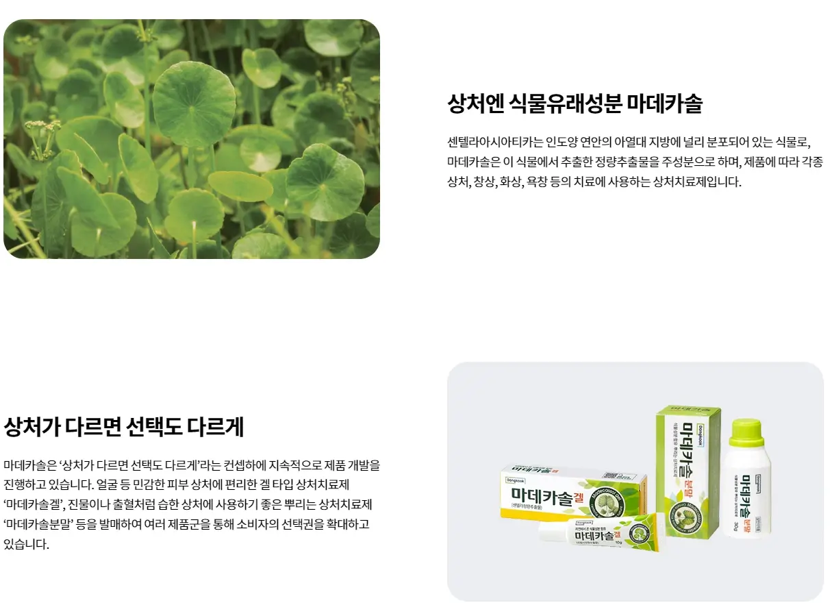 마데카솔은 센텔라아시아티카라는 식물에서 추출한 성분을 주원료로 하여 상처 치유에 효과적인 것으로 알려져 있습니다.