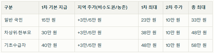 - 지급액은 소득·거주지·가구 상황에 따라 다르며, 2차 지급까지 합산 시 최대 58만 원까지 받을 수 있습니다.