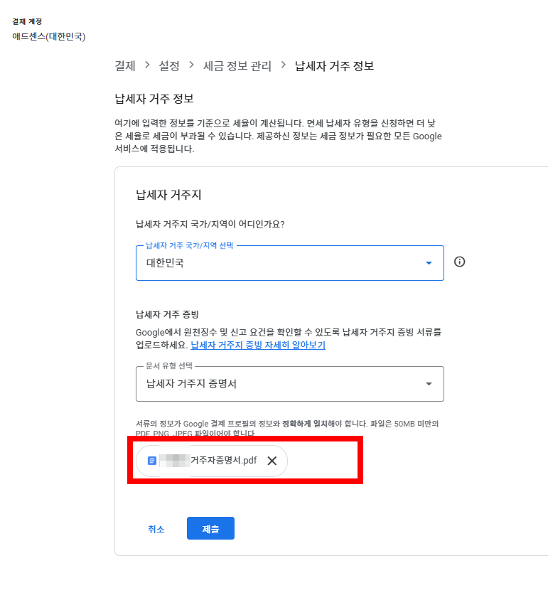 - 에드센스 / 지급 / 지급정보 / 납세자 거주지 / 세금정보 업데이트하기