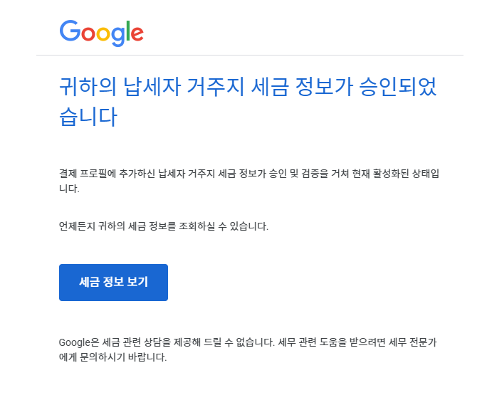 다음날, 구글 납세자 세금정보 승인 메일이 왔습니다. 완료~