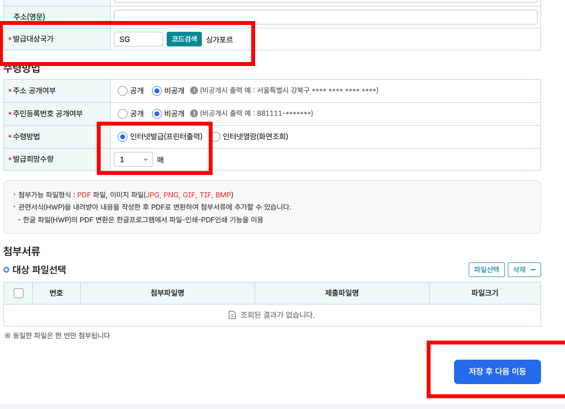 수령방법은 파일형태로 저장해서 올려야하기때문에 인터넷 발급을 선택하였습니다.