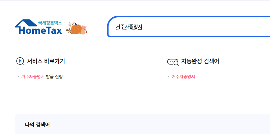 홈텍스 화면에서 '거주자증명서' 라고 검색 후 서비스에 나오는 '거주자증명서 발급신청' 을 선택합니다.